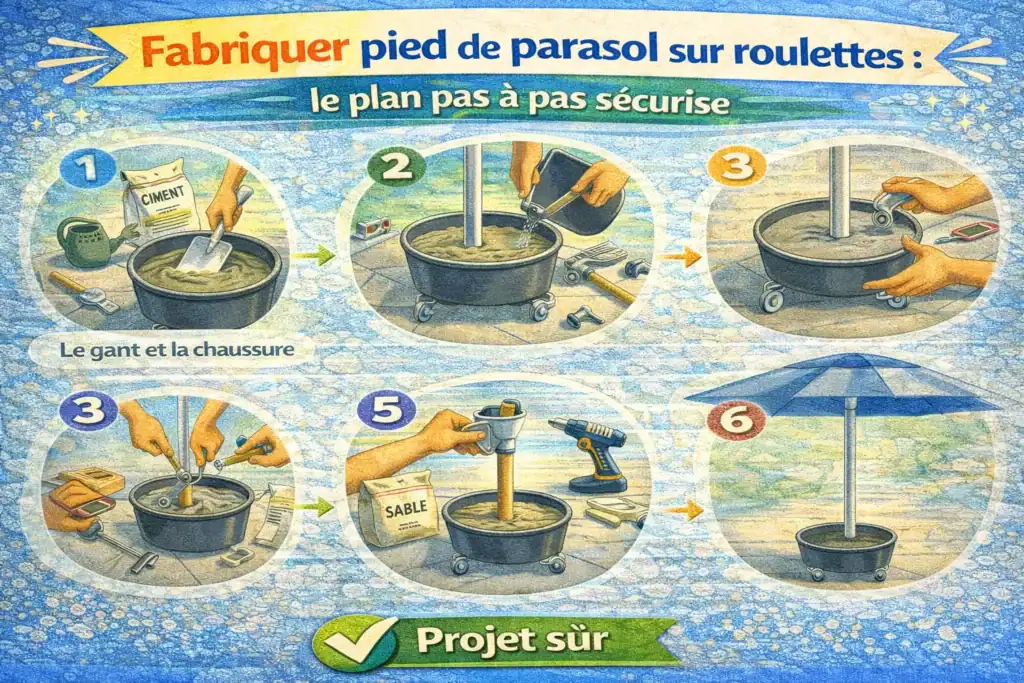 Un vent de 50 km/h renverse un pied de parasol insuffisamment lesté. Ce guide propose un tutoriel DIY clair pour fabriquer un pied de parasol sur roulettes sécurisé, réalisable en 2 à 4 heures par un bricoleur moyen. Vous aurez une base mobile stable, freinable et résistante aux intempéries. Vous voulez un parasol haut de gamme ?